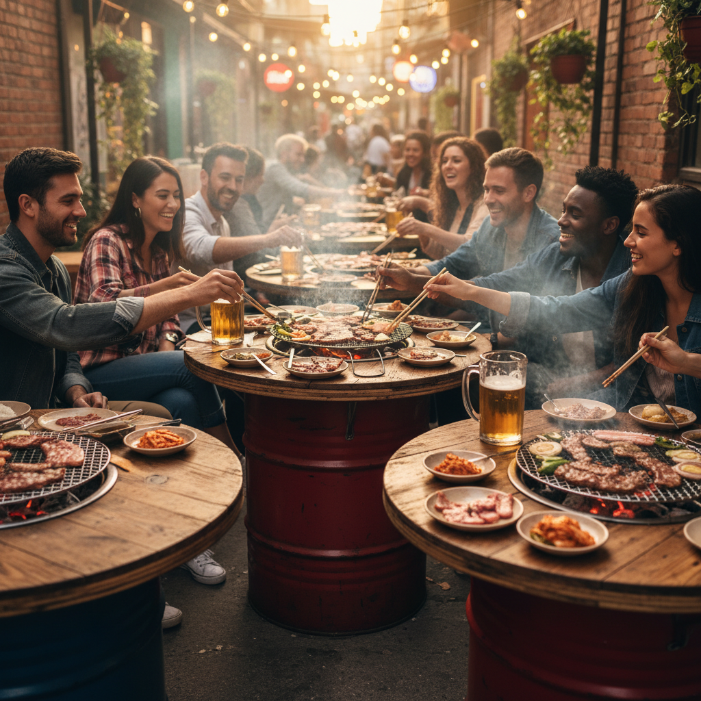 先日、友人と訪れたお店でこのドラム缶テーブルに座ったんですが、これがもう、不思議と居心地がいいんです!ちょっと狭いかな?と思いきや、自然と距離が縮まって会話が弾むんですよね。まるで韓国の路地裏にいるような気分で、お肉もマッコリもいつも以上に美味しく感じちゃいました😋