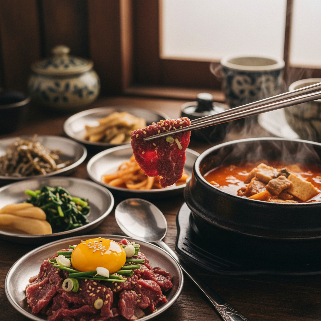 まず「生食」について。日本でも新鮮な魚介類を生で食べる文化がありますが、韓国ではお肉の生食、特に「ユッケ」が非常に人気です。そして、ここでぜひ知ってほしいのが「韓牛(ハヌ)」の存在です。韓牛は、日本でいう和牛のような位置づけで、非常に高品質で美味しい牛肉なんです。特に新鮮な韓牛を使ったユッケは、口の中でとろけるような旨味があって格別!韓国で飲食店をサポートしていると、韓牛の仕入れや鮮度管理の重要性を肌で感じます。日本でも韓国料理店を経営される方には、この韓牛の魅力をどう伝えるか、いつも一緒に考えています。