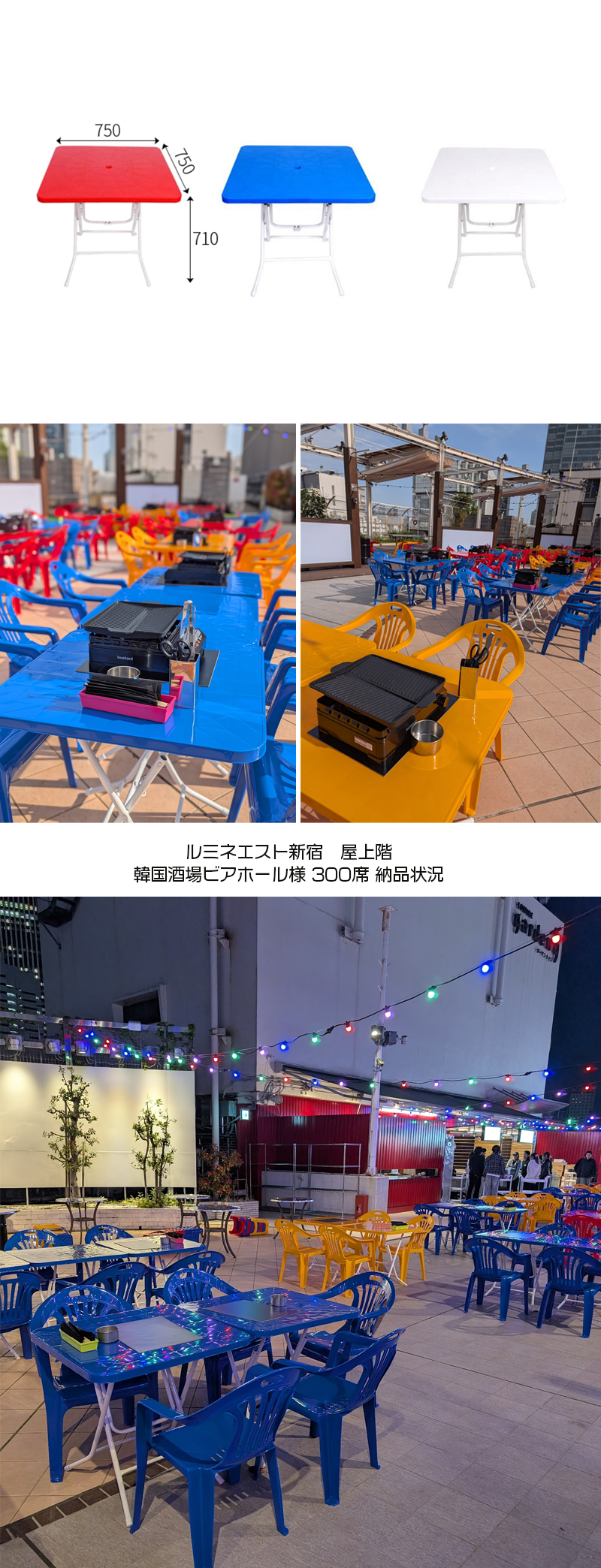 - 商品概要 直方形折り畳み式プラスチック天板テーブル(パラソルホール付き、青色/赤色)です。屋外用(テラス・イベント・キャンプなど)に適した簡易テーブルです。