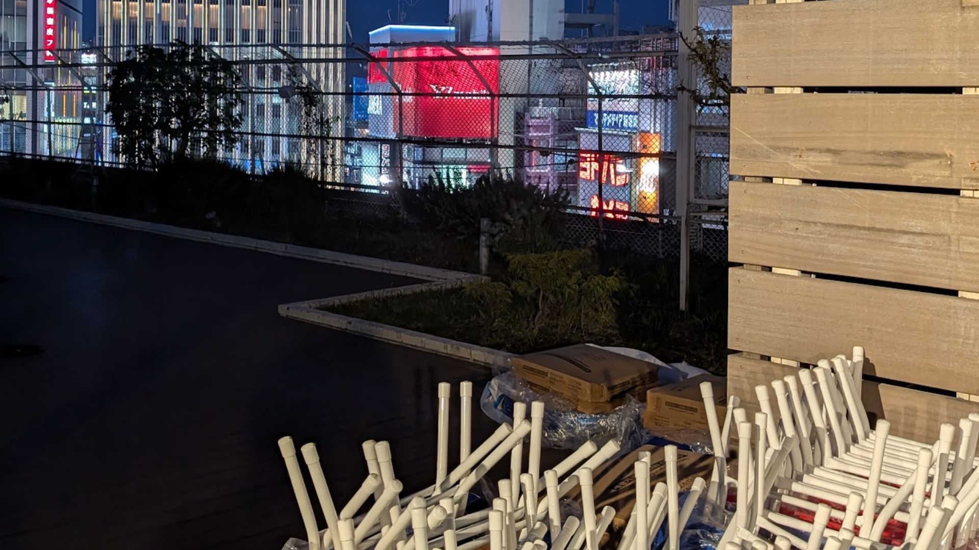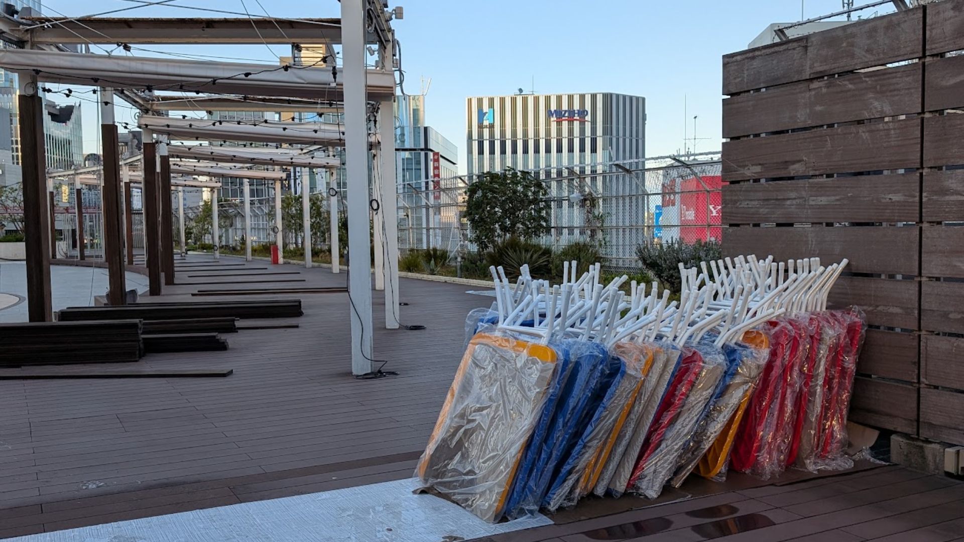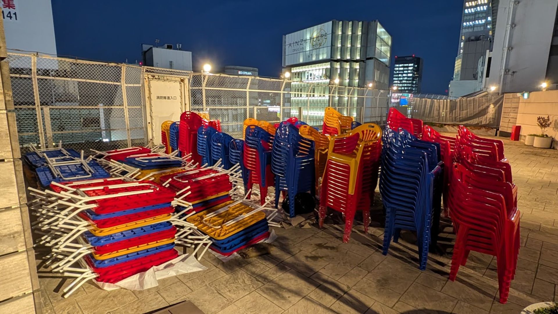 韓国風のライトな感じの飲食店を屋外で楽しむというコンセプトと言う事で、韓国ではよく見かけるプラスチック椅子やテーブルをおよそ300席分、搬入させて頂きました。