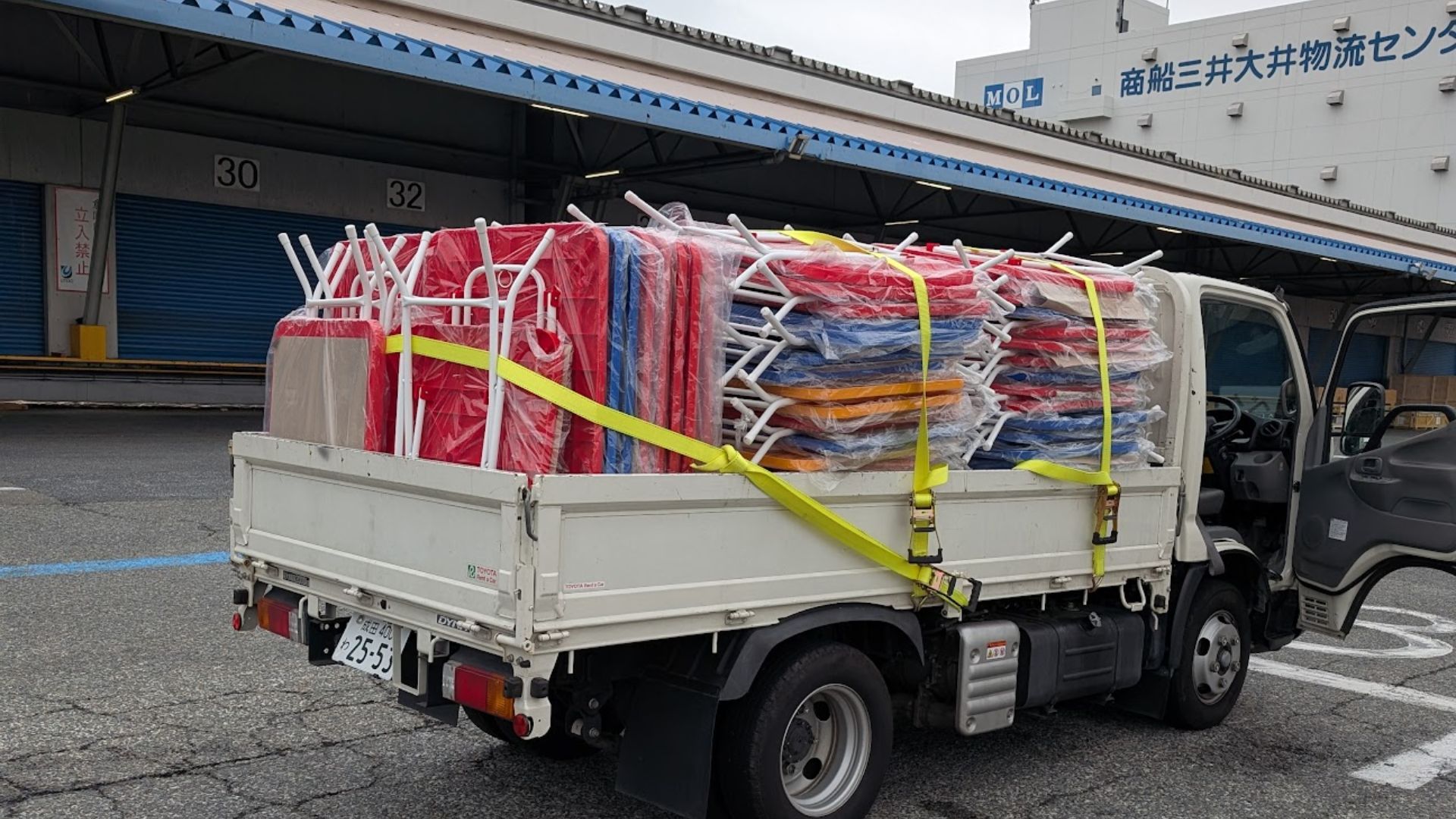今回、新規オープンされる、東京都内の大型飲食店様へ、屋外用のテーブル・椅子その他を納品をさせて頂きました。全て韓国からの輸入になります。通常は保税倉庫から運送業者にお任せするのですが、イラン情勢ならびに、荷卸しする時間が30分以内とかなり厳しい状況だった事から、お客様負担を出来るだけ減らすために、自社で、運搬から搬入まで全て行う事に致しました。