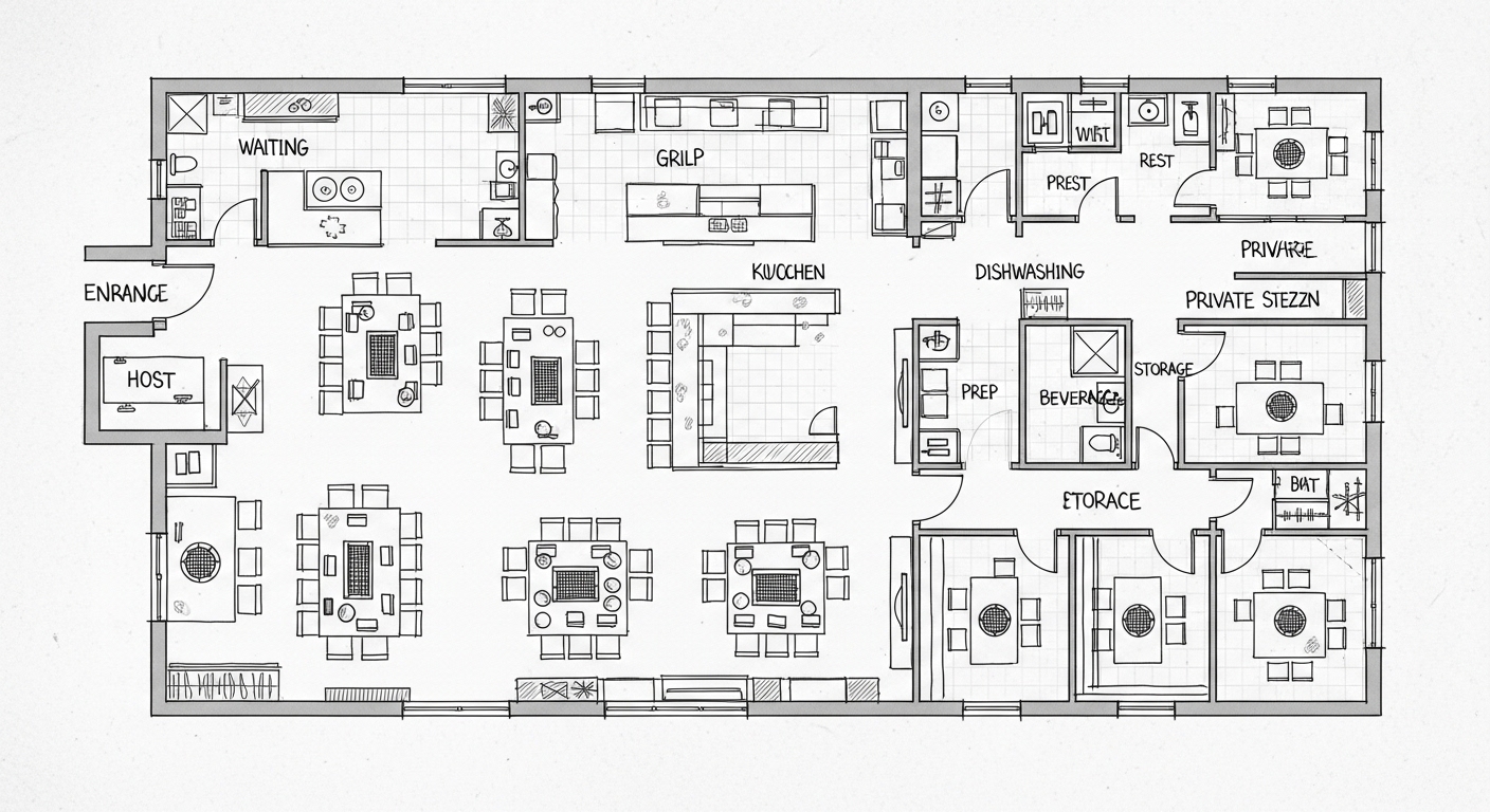 実務では、コンセプト作りを感覚だけで進めないことが大切です。最初に、想定客単価、主力客層、ピーク時の卓回転数を置きます。そのうえで、必要な席数と1卓あたりの滞在イメージを決め、客席レイアウトに落とします。